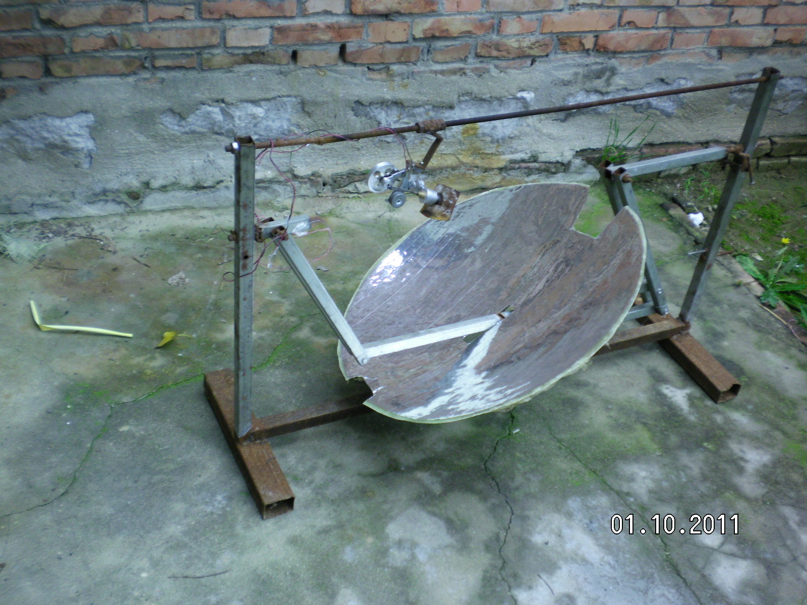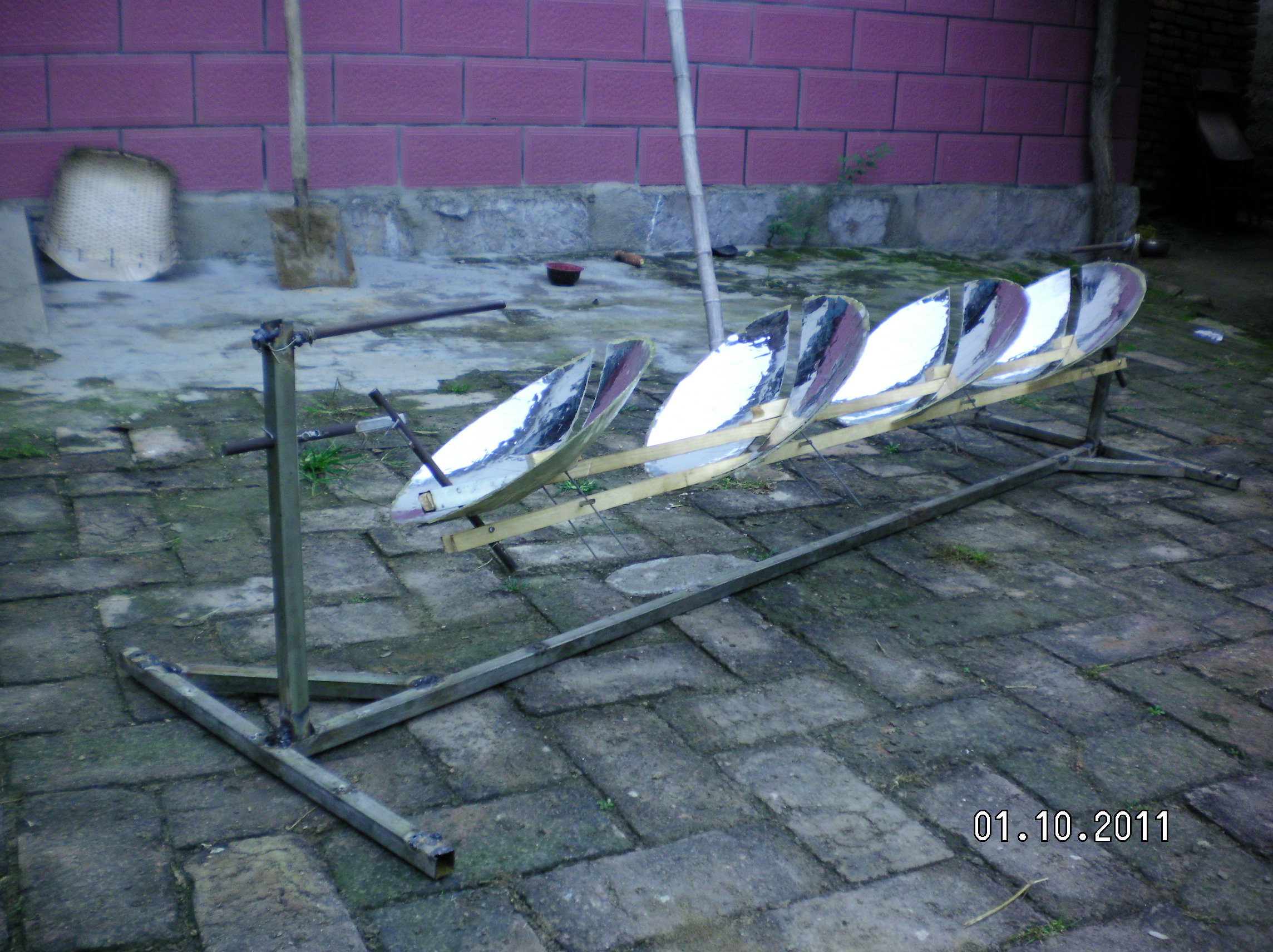 隨著全球環(huán)境惡化和日益嚴(yán)峻的能源形勢(shì)世界各國(guó)對(duì)太陽(yáng)能熱發(fā)電越來越重視。現(xiàn)在最常用的太陽(yáng)能熱發(fā)電系統(tǒng)主要有槽式、蝶式和塔式,槽式和蝶式的光熱部件必須隨聚光鏡做相應(yīng)的運(yùn)動(dòng),槽式各個(gè)光熱部件復(fù)雜昂貴,蝶式光熱部分只能單獨(dú)使用塔式的受熱部分出現(xiàn)故障很難維修這三種系統(tǒng)都有自己的缺點(diǎn)?;诖宋以O(shè)計(jì)了平行定焦太陽(yáng)能聚光集熱發(fā)電系統(tǒng):主要有一對(duì)支柱.一對(duì)轉(zhuǎn)軸.一對(duì)動(dòng)臂.旋轉(zhuǎn)拋物面聚光鏡.一根托桿.一根平行桿.平行連桿組成將兩支柱固定在一條直線上,兩轉(zhuǎn)軸安裝在兩支柱上兩轉(zhuǎn)軸可以左右轉(zhuǎn)動(dòng),兩動(dòng)臂安裝在兩轉(zhuǎn)軸上使可以隨轉(zhuǎn)軸左右前后擺動(dòng)。托桿安裝在兩動(dòng)臂上,平行桿與托桿平行安裝在兩動(dòng)臂上,這樣動(dòng)臂.托桿.平行桿構(gòu)成一個(gè)平行凹框。在旋轉(zhuǎn)拋物面鏡原點(diǎn)安一橫軸并切去部分旋轉(zhuǎn)拋物面鏡,在橫軸兩端垂直安裝兩根平行連桿,把旋轉(zhuǎn)拋物面鏡的橫軸安裝在托桿上。在平行桿上安裝連桿軸把平行連桿與連桿軸連接在一起。所述旋轉(zhuǎn)拋物面鏡的焦距等于托桿與轉(zhuǎn)軸之間動(dòng)臂的長(zhǎng)度。將動(dòng)臂對(duì)準(zhǔn)太陽(yáng)陽(yáng)光就會(huì)聚焦到固定點(diǎn)上在這些位置安裝光熱部件就會(huì)得到熱能用于熱發(fā)電。這種結(jié)構(gòu)是雙軸定焦所以效率很高,抗風(fēng)性好。這種結(jié)構(gòu)可以做成很小裝在高在15-20cm的透明罩內(nèi)安裝在樓頂或樓房南墻上,為人們提供開水或蒸汽。請(qǐng)看模型照片: