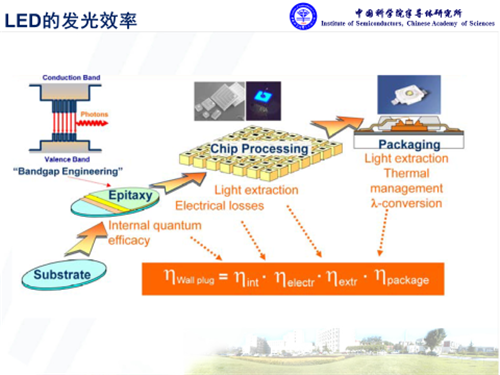 氮化鎵是直接帶隙的半導(dǎo)體材料,在光電應(yīng)用方面具有獨(dú)特優(yōu)勢(shì)。基于氮化鎵的HB-LED對(duì)于通用照明來(lái)說(shuō),其核心問(wèn)題是發(fā)光效率。其中外量子效率主要取決于三個(gè)層面的因素,內(nèi)量子效率、光提取效率,還有封裝方面的熒光轉(zhuǎn)化等效率,而且每個(gè)環(huán)節(jié)都息息相關(guān)。