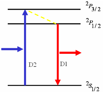 半導(dǎo)體泵浦堿金屬蒸氣激光器(DPAL,Diode Pumped Alkali vapor Laser),是由半導(dǎo)體激光器(LD,Laser Diode)作為泵浦源,堿金屬飽和蒸氣作為激光的增益介質(zhì)以實現(xiàn)高功率的激光輸出。堿金屬元素包括鋰(Li),鈉(Na),鉀(K),銣(Rb),銫(Cs),它們最外層只有一個價電子,表現(xiàn)出相似的能級結(jié)構(gòu)如圖2-6所示。2S1/2為基態(tài)能級,2P1/2和2P3/2為自旋-軌道相互作用而劈裂的激發(fā)態(tài)能級,其中2P1/2 → 2S1/2躍遷對應(yīng)D1譜線,稱為激光躍遷;2S1/2 → 2P3/2躍遷對應(yīng)D2譜線,稱為抽運躍遷,對堿金屬蒸氣進行抽運就是要實現(xiàn)2S1/2和2P1/2能級之間的粒子數(shù)反轉(zhuǎn)。