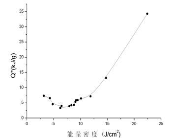 如圖3-5所示,單位面積除漆質(zhì)量先是隨著能量密度上升,在能量密度為6~8 J/cm2之間達到峰值,隨后下降。當激光能量密度大于12 J/cm2后,單位面積除漆質(zhì)量顯著下降,此時,激光與樣品表面的作用機理可能已發(fā)生突變。而進一步分析Q*值(Q*=激光能量密度/單位面積除漆質(zhì)量)隨能量密度的變化曲線,如圖3-6所示??梢钥闯觯斈芰棵芏却笥?0 J/cm2后,Q*值隨著激光能量密度的提高大幅提高,說明激光能量的利用效率顯著下降。且在入射激光能量密度為6.5 J/cm2時,Q*值為極小值,約為3 kJ/g。
