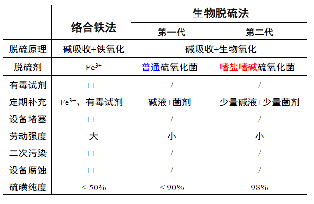 經過中試連續(xù)運行我們發(fā)現嗜鹽嗜堿硫氧化脫硫體系相比傳統(tǒng)絡合鐵法具有明顯的優(yōu)勢:極端微生物可耐受的環(huán)境優(yōu)勢更為突出,僅需定期補充堿液及少量菌劑就可保證整個系統(tǒng)連續(xù)運轉,勞動強度小,且系統(tǒng)回收單質硫磺的純度高達98%。更多內容見下表。