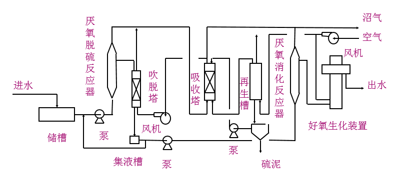 在高硫酸鹽廢水處理集成系統(tǒng)中,首先硫化氫先經過吹脫處理,降低硫化氫對后續(xù)反應中對厭氧反應的抑制。經吹脫過的廢水進入厭氧硫酸鹽還原反應器,進行一系列后續(xù)高效的硝化與反硝化處理,最終出水達標排放(圖1-9)。