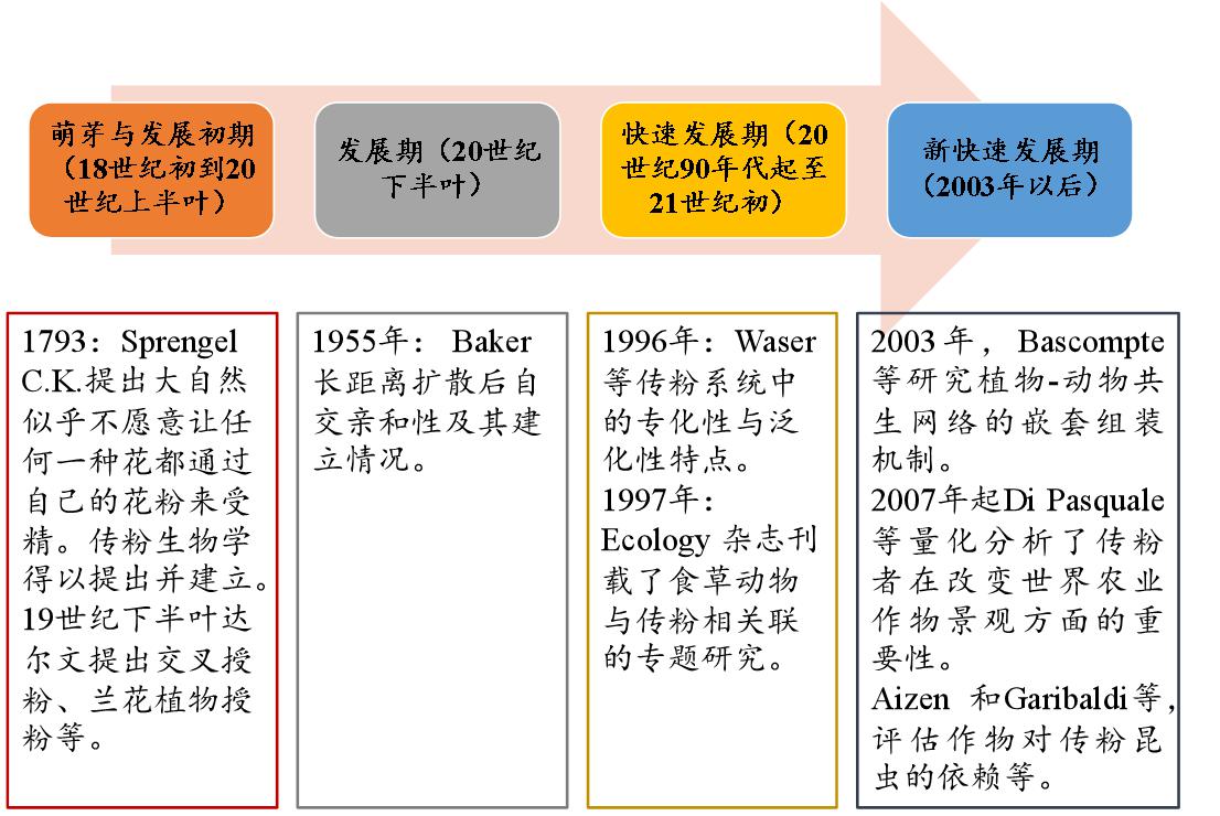 由于傳粉昆蟲的重要性以及目前所面臨的危機(jī)已經(jīng)引起科學(xué)家和民眾的廣泛關(guān)注。諸多地區(qū)級、國家級乃至全球級別的傳粉研究已經(jīng)取得了階段性的成果。就全球范圍來說,傳粉昆蟲的研究主要包括四個時期,分別為:1)萌芽與發(fā)展初期(18世紀(jì)初到20世紀(jì)上半葉);2)發(fā)展期(20世紀(jì)下半葉);3)快速發(fā)展期(20世紀(jì)90年代起至21世紀(jì)初);4)新快速發(fā)展期(2003年以后)。