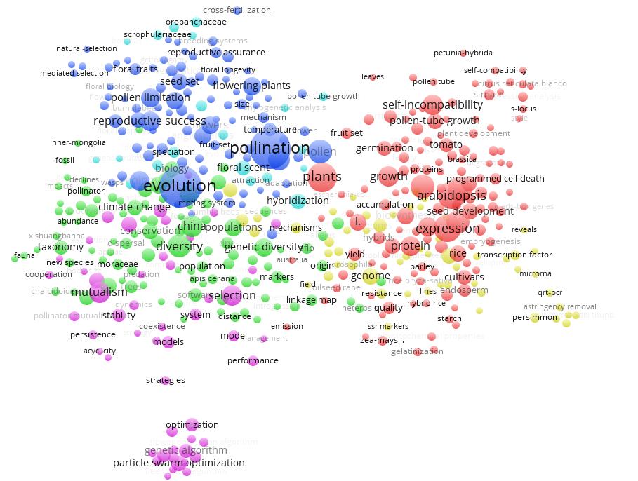 利用Vos Viewer軟件分析2013-2017年中國傳粉生物學(xué)領(lǐng)域的SCI論文,獲得中國傳粉生物學(xué)領(lǐng)域的研究熱點是:1)植物花粉管生長、發(fā)育等分子、細(xì)胞層面基礎(chǔ)機(jī)制研究;2)傳粉昆蟲的分類學(xué)研究,及其遺傳多樣性、保護(hù)、種群擴(kuò)散等方面的研究;3)昆蟲傳粉在植物遺傳育種、進(jìn)化中發(fā)揮重要作用;4)與傳粉相關(guān)的植物轉(zhuǎn)錄因子、microRNA、殺蟲劑耐藥性等方面的研究;5)傳粉昆蟲的種群優(yōu)化、傳粉昆蟲互作等方面的研究。
