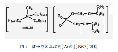 近年來(lái)我們開展離子液體萃取劑的研究,例如[A336 ] [ P507]。該結(jié)構(gòu)簡(jiǎn)單的理解就是將P507進(jìn)行有機(jī)錢鹽的皂化,有機(jī)錢鹽常采用Aliquat336,國(guó)內(nèi)商品名稱為N263。[ A336 ] [ P507]的結(jié)構(gòu)如圖1所示,是一種典型的離子液體,所以我們稱之為離子液體萃取劑。