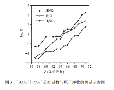 [A336 ] [ P507]對(duì)稀土離子的萃取趨勢(shì)是隨著原子系數(shù)增加分配系數(shù)增大,如圖3所示。不同酸性條件下的相對(duì)分配系數(shù)關(guān)系順序:HN03 > HCl >H2SO4,與酸根離子的水化能ΔG順序一致,硝酸根的水化能最低(ΔGO=-314kJ/mol),硫酸根水化能最高(ΔGO =-1103 kJ/mol )。