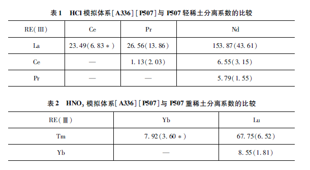 P507(III)萃取稀土按照正序萃取,遵循“四分組效應(yīng)”,稀土的分配系數(shù)隨著原子序數(shù)的增加而增大,而堿性萃取劑[A336]C1在HN03體系中通過(guò)陰離子交換萃取稀土是倒序萃取,稀土的分配系數(shù)隨著原子序數(shù)的增加而減小。兩種效應(yīng)共同作用,導(dǎo)致[A336 ] [ P507 ]分離稀土選擇性增強(qiáng),相鄰元素間的分離系數(shù)明顯提高。同時(shí),陽(yáng)離子[A336]+和陰離子[P507 ]-的離子半徑大,空間位阻增加,也有助于提高稀土(III)的萃取選擇性。模擬實(shí)際體系的組分混合物,在HCl體系中在輕稀土間的分離系數(shù)也有較大的提高,尤其是Pr/Nd分離系數(shù)5. 79明顯高于P507體系的1. 55(徐光憲主編,《稀土》,第二版,1995 ) ,見(jiàn)表1。在HN03體系中重稀土Tm/Yb/Lu的分離系數(shù)較大,明顯高于目前的P507體系(李德謙等,中國(guó)發(fā)明專利,ZL200510016682. 6 ),見(jiàn)表2。[A336 ] [P507 ]的特殊結(jié)構(gòu)對(duì)部分稀土離子分離的選擇性方面比較突出,與其較大的空間位阻有關(guān)。
