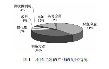 這里面是不同的研究主題分布,還是以儲(chǔ)氫合金的開發(fā)居多一點(diǎn),然后還有催化劑、改性等(圖1)。我覺(jué)得在這里面可能有三個(gè)領(lǐng)域在技術(shù)上發(fā)展比較突出一點(diǎn)。第一個(gè)就是成分的改變,通過(guò)改變儲(chǔ)氫合金成分開發(fā)新的合金提高了鎳氫電池容量,是一個(gè)很重要的進(jìn)步。傳統(tǒng)是ABS型的,后來(lái)跟ABS型的和AB2型的結(jié)合到一起,就變成了A2B7型的,這就是口本三洋公司開發(fā)出來(lái)的。這個(gè)儲(chǔ)氫合金成為了目前研究的主流,容量比傳統(tǒng)的要大很多,成分上的突破是一個(gè)很大的進(jìn)步。第二個(gè)是甩帶快淬技術(shù)在儲(chǔ)氫合金粉體制備上的應(yīng)用,原來(lái)這種技術(shù)最早是用來(lái)制備非晶態(tài)合金的,后來(lái)用到了永磁粉體的制備,現(xiàn)在又開始進(jìn)人到了鎳氫電池上面來(lái)了,對(duì)于鎳氫電池容量和穩(wěn)定性的提高都有非常大的幫助。第三個(gè)重要的突破的是儲(chǔ)氫合金表面改性,表面有一層鎳,可以進(jìn)一步提高電導(dǎo)率,增加電流。這三方面是在技術(shù)上有了比較大的提高和發(fā)展。