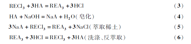萃取分離過(guò)程主要利用有機(jī)萃取劑萃取料液中易萃組分,獲得高純度的難萃組分,通過(guò)洗滌有機(jī)相的難萃組分獲得純的易萃組分,達(dá)到分離目的。目前稀土分離均使用酸性萃取劑(HA),萃取過(guò)程可用反應(yīng)(3)表示,為了提高和穩(wěn)定萃取劑的萃取分離能力,一般均對(duì)酸性萃取劑進(jìn)行皂化后再與待分離的稀土料液進(jìn)行萃取交換,過(guò)程為反應(yīng)(4),(5),負(fù)載稀土的有機(jī)相用鹽酸進(jìn)行洗滌
