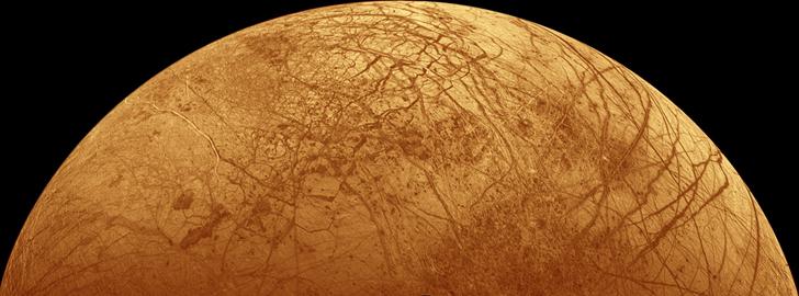 對木衛(wèi)二最早的空間觀測可追溯到上世紀(jì)70年代。它的表面平坦;隕石坑很少,只有3個直徑大于5km的。這是美國發(fā)射的旅行者2號拍攝的影像: