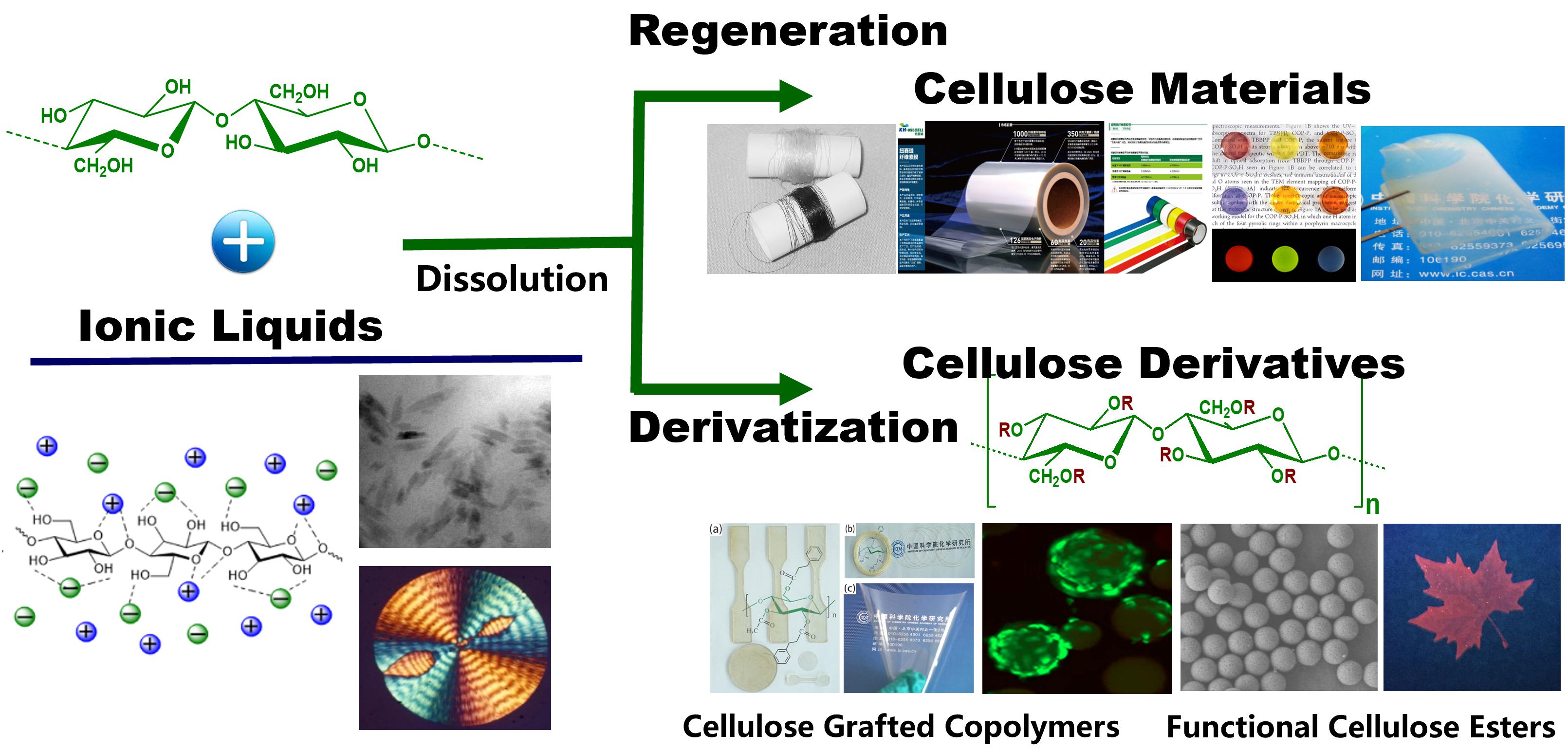 我們做出的兩類離子液體溶劑,可以在一個很溫和的條件下(一般不超過100℃)將纖維素溶解。過去一二十年有很多人做纖維素的離子液體體系,目前公認最好的三種離子液體中有兩種是我們發(fā)明的,其中AmimCl可以溶解木材,被稱為溶解能力最強的溶劑。后來我們提出了它的溶解機理,我們認為離子液體陰陽離子結構和纖維素羥基的分別作用把里面原來氫鍵打開,像剪漁網(wǎng)似的,使它變成線性的分子才能溶解。