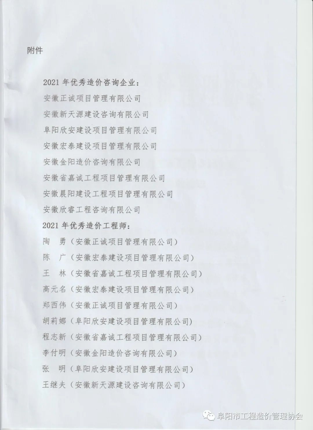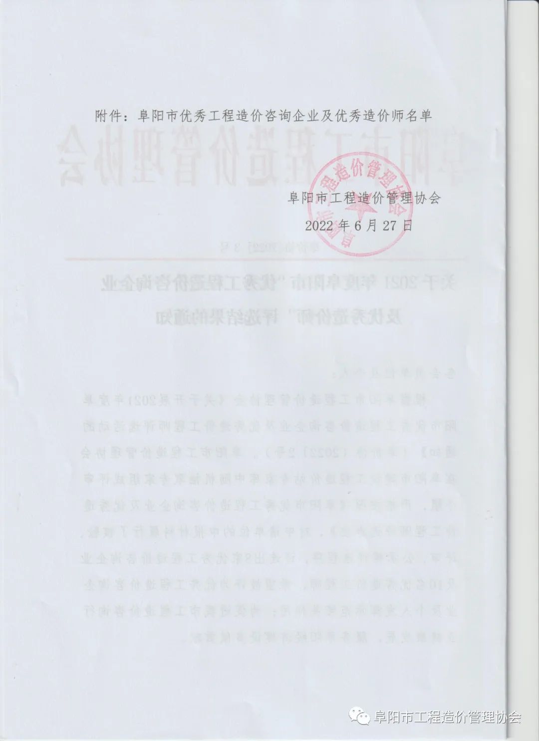 關(guān)于2021年度阜陽市“優(yōu)秀工程造價(jià)咨詢企業(yè)及優(yōu)秀造價(jià)師”評(píng)選結(jié)果的通知